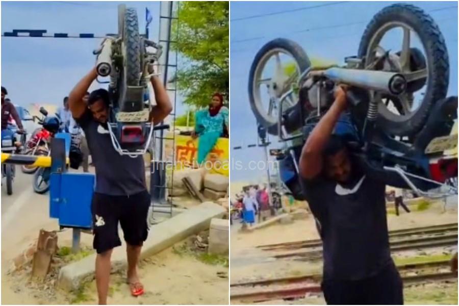 झांसी में युवक ने कंधे पर उठाई बाइक, रेलवे ट्रैक पार करने का वीडियो वायरल